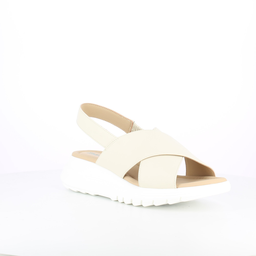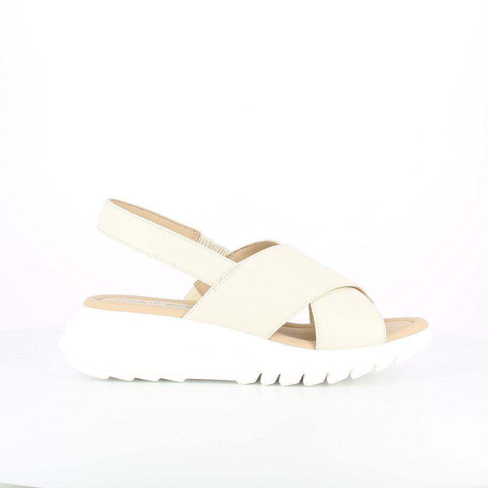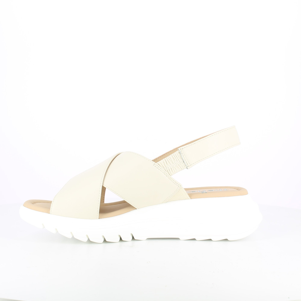 Sandali platform altezza 45 dal design moderno e deciso, perfetti per completare look estivi con un tocco di carattere. La tomaia è composta da fasce incrociate che avvolgono il piede con comfort. Il cinturino posteriore garantisce una calzata stabile, mentre la suola alta con battistrada dentellato assicura slancio e aderenza durante tutta la giornata. Modello versatile e facile da abbinare.